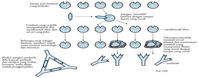 Dalam kondisi tidak terpapar suatu antigen tertentu, sel limfosit B akan tetap dalam keadaan dormant (mati suri) di dalam jaringan limfoid. Saat antigen masuk ke dalam tubuh, makrofag dalam jaringan limfoid akan memakan/ memfagositosis antigen tersebut dan akan mengundang limfosit B didekatnya. Selain itu, antigen tersebut akan dibawa ke sel T pembantu pada waktu yang bersamaan. Limfosit B akan berproliferasi menghasilkan sel plasma dan sel B memori. Setelah itu, sel plasma akan menghasilkan antibodi sebagai sistem kekebalan humoral. Antibodi tidak dapat menembus sel, sehingga hanya akan bekerja saat antigen berada di luar sel misalnya dalam aliran darah. Antibodi bekerja dengan dua cara untuk mempertahankan kekebalan tubuh terhadap suatu agen penyakit yaitu yang pertama dengan cara langsung menginaktifasi agen penyebab penyakit, dan yang kedua dengan mengaktifkan sistem komplemen yang kemudian akan menghancurkan agen penyakit tersebut.